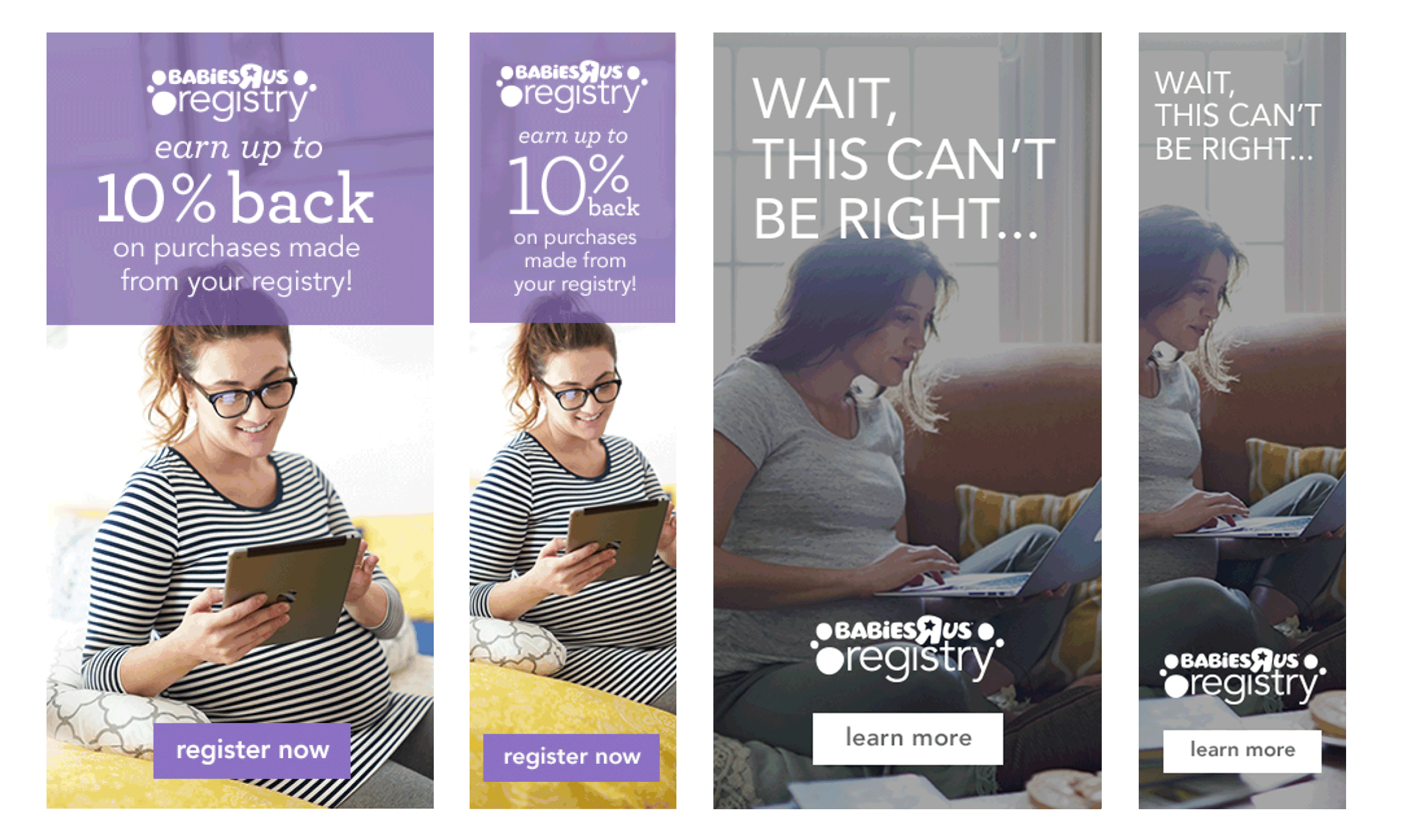 Solution: Using the insight that new parents are gathering a lot of information even before starting shopping, the Creative solutions featured lifestyle imagery and relatable messaging that connect to parents to begin helping them make sense of everything. Creative showed a simplified registry process and highlighted the 10% back as the main benefit.