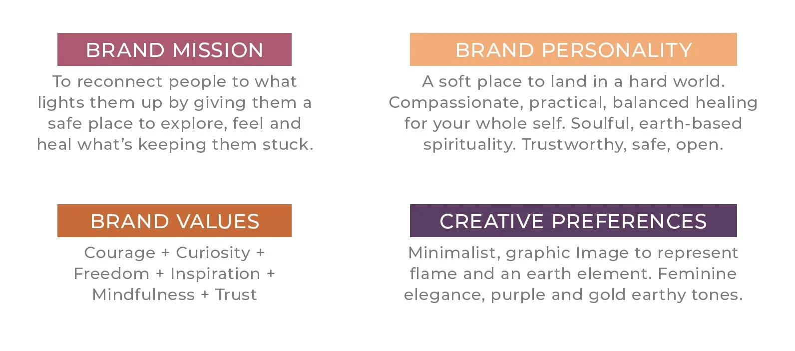 First, I met with my client to clearly define the unique brand elements that the logomark should represent. We outlined the brand mission, personality and values, and I gave her the opportunity to share any creative preferences she had, including colors, fonts, and logomark type. This step was essential to ground us in using the same language as I develop and refine her brand logo, while she defines her brand.